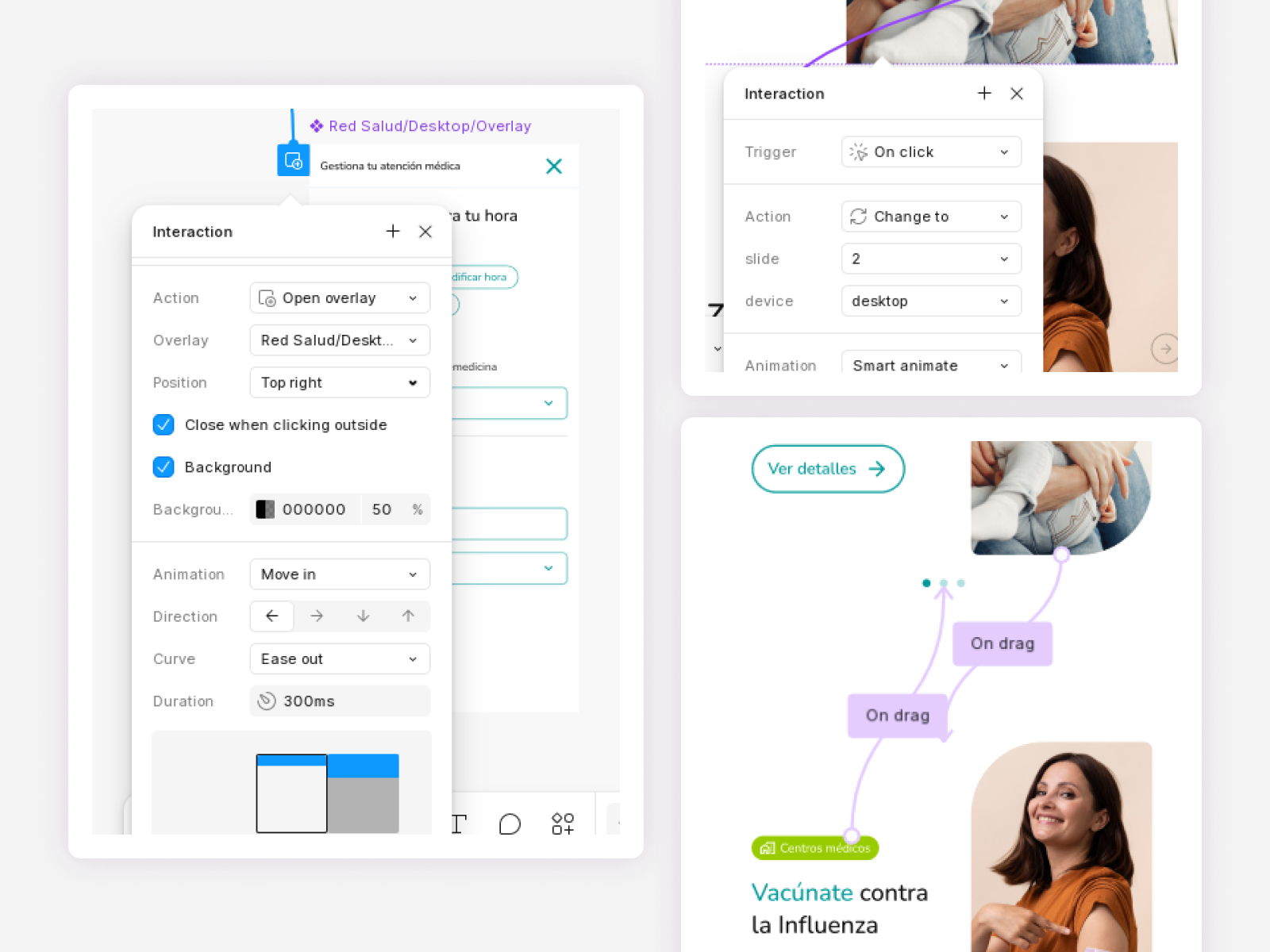 Resultado: Según el wireframe recibido se diseñó una interfaz limpia para disminuir la carga cognitiva que se podía apreciar en el actual sitio web para una mejor lectura y entendimiento. Se realizó un prototipo funcional animando componentes como el hero con 3 slides informativas. En formato desktop se animó el slider con "On click" y en mobile se modificó la experiencia a la interacción "On drag". También se implementó el componente overlay mencionado anteriormente con la interacción de prototipado de Figma "Open overlay" en desktop y mobile.