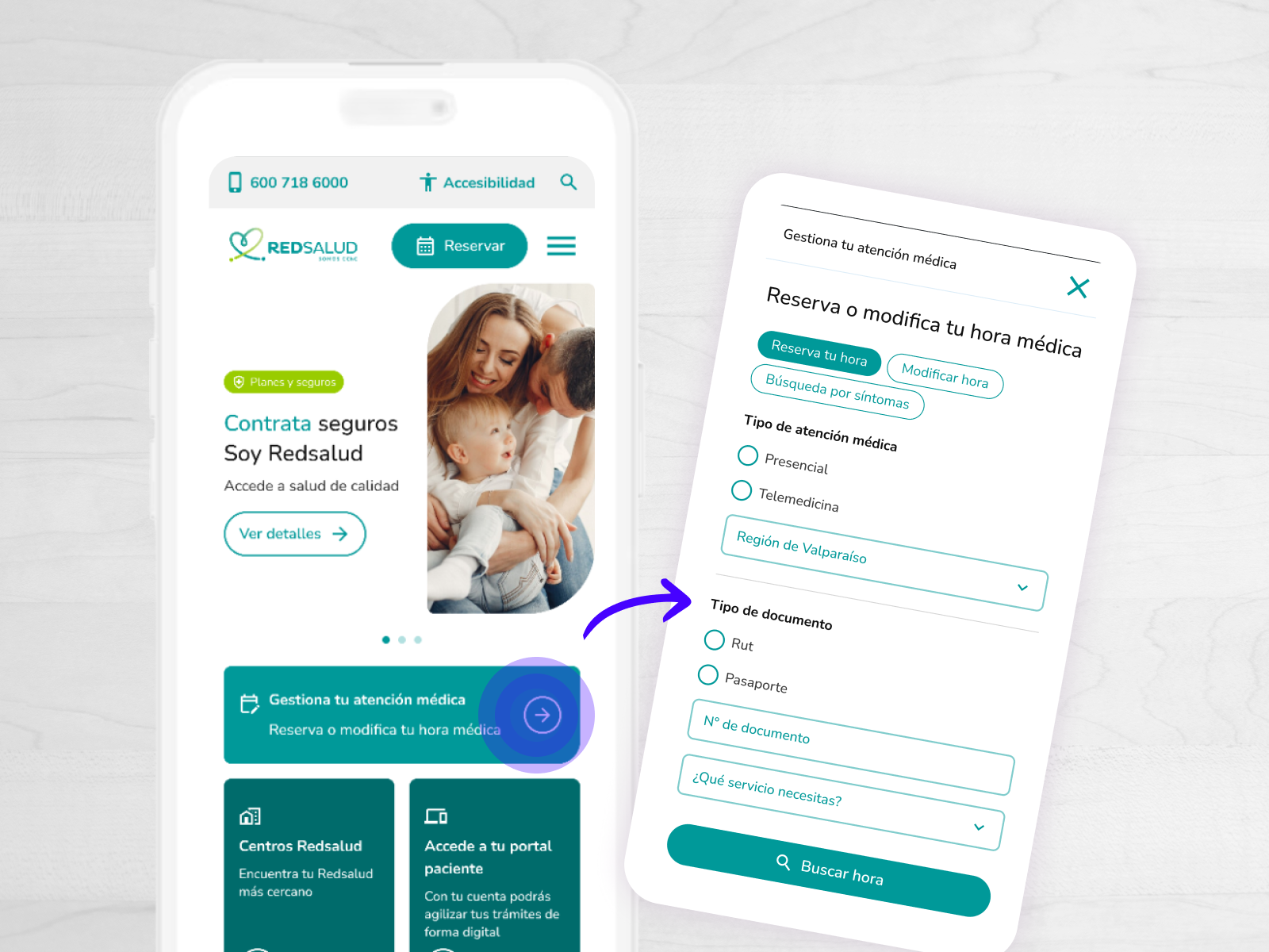 Proceso: Se realizó un benchmark de clínicas nacionales e internacionales. Se investigó iconografía, recursos visuales y buenas prácticas. Se requería implementar un elemento overlay donde el usuario pudiera gestionar su atención médica.